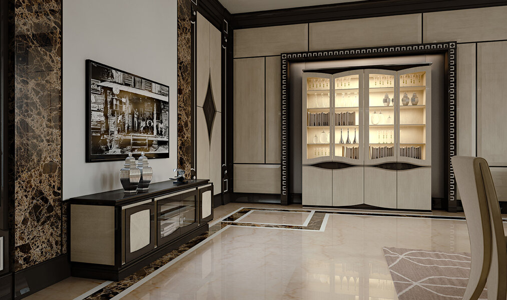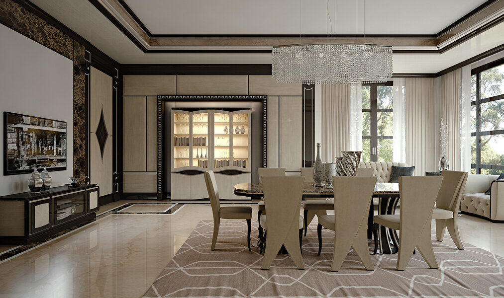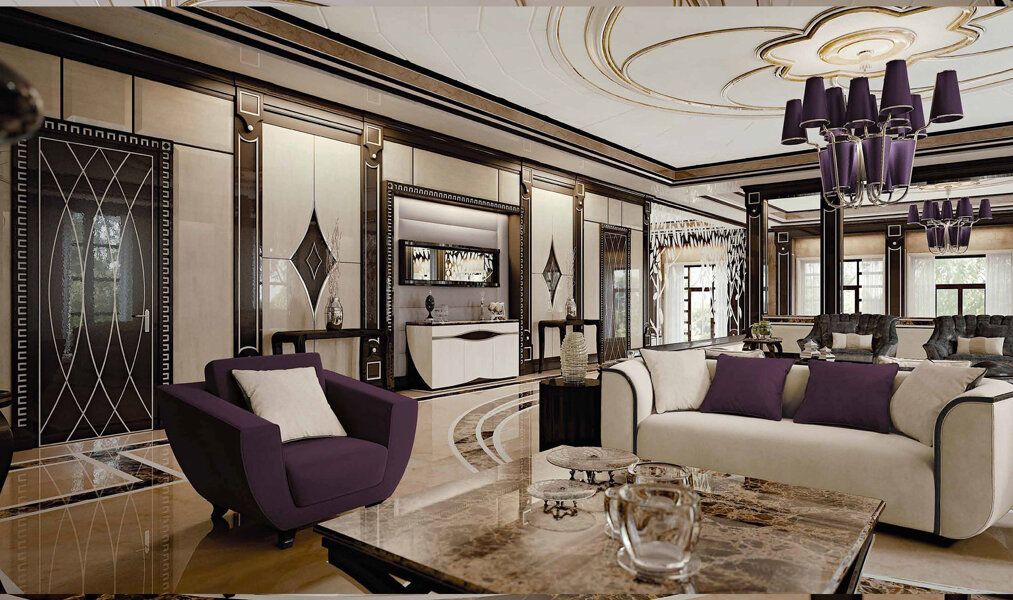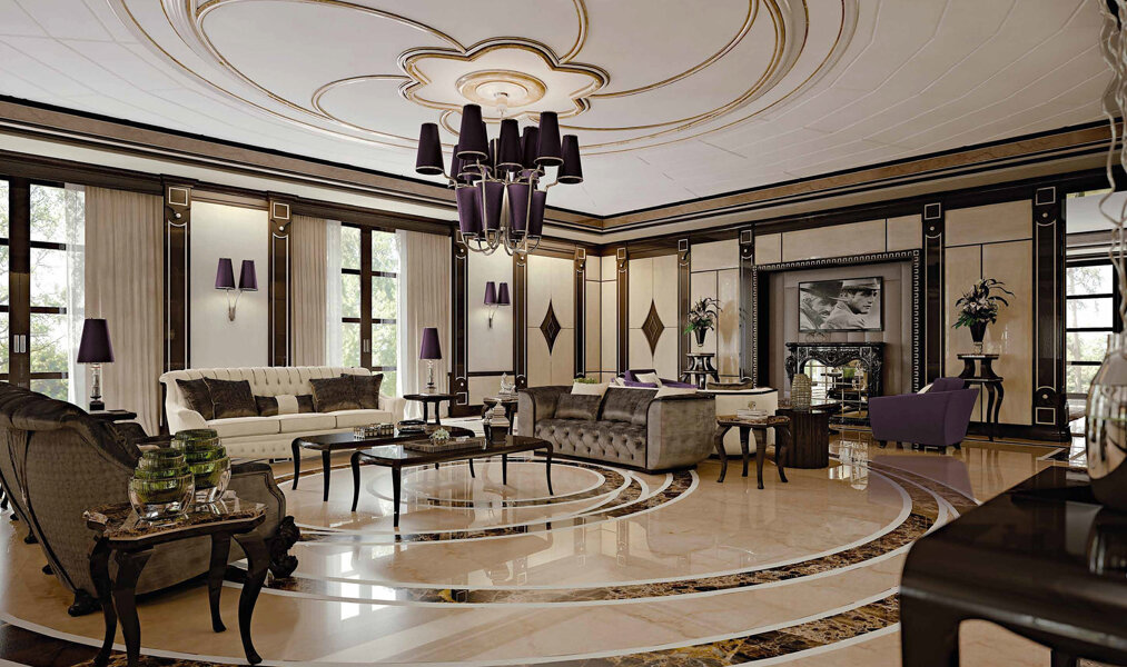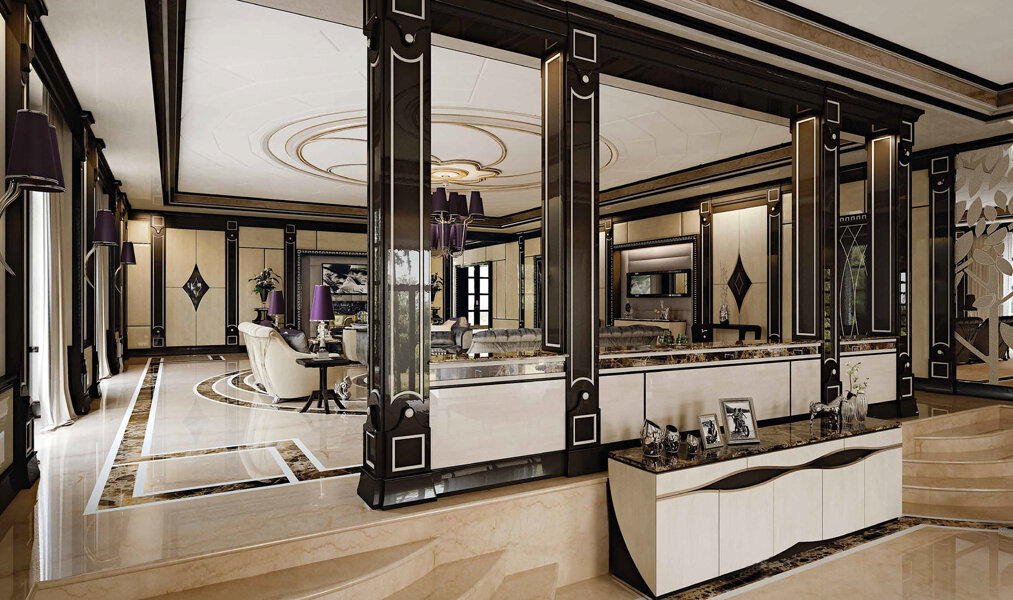 A villa in Baku featuring Art Deco design furnishings crafted from luxurious materials. The interior exudes opulence with rich textures, bold geometric patterns, and exquisite craftsmanship, offering a sophisticated living space.