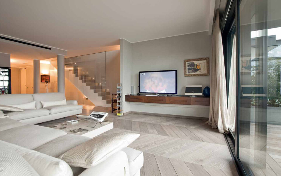 A stunning villa in Como showcasing contemporary design. Features light, airy furnishings crafted from natural materials, creating a serene and inviting atmosphere. The space harmoniously blends elegance with modernity, offering both comfort and style.