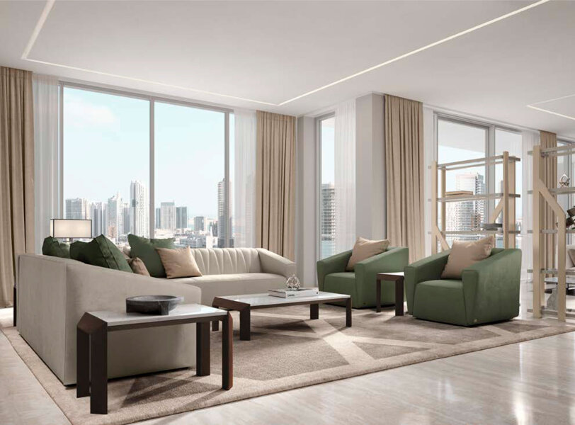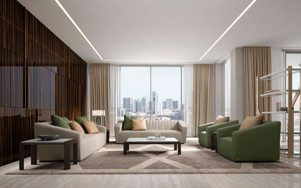 An upscale Los Angeles apartment epitomizing luxury contemporary style. Outfitted with sleek, modern furnishings and high-end finishes that exude sophistication. The design seamlessly integrates cutting-edge technology with timeless elegance.