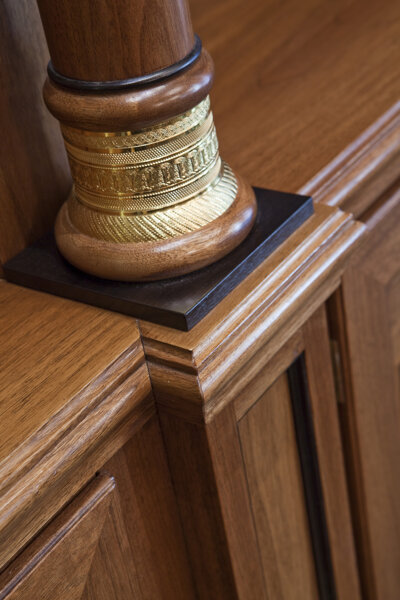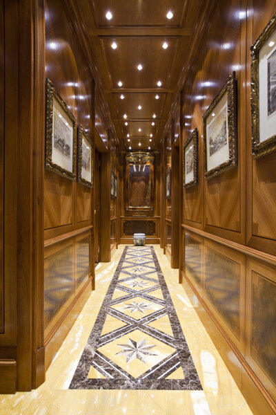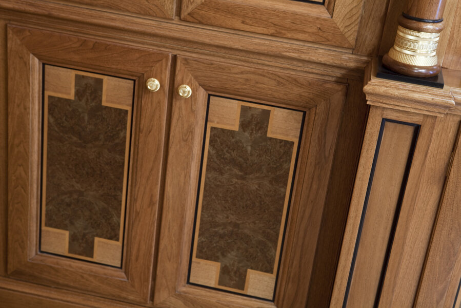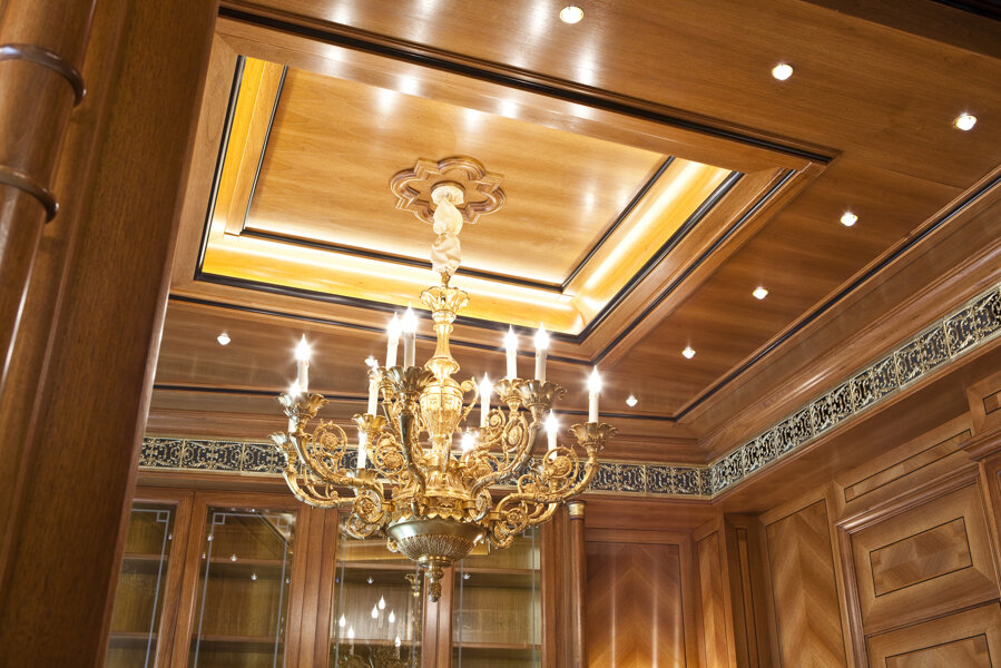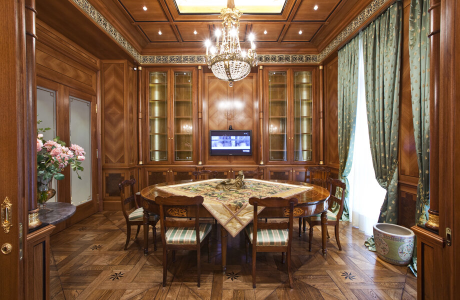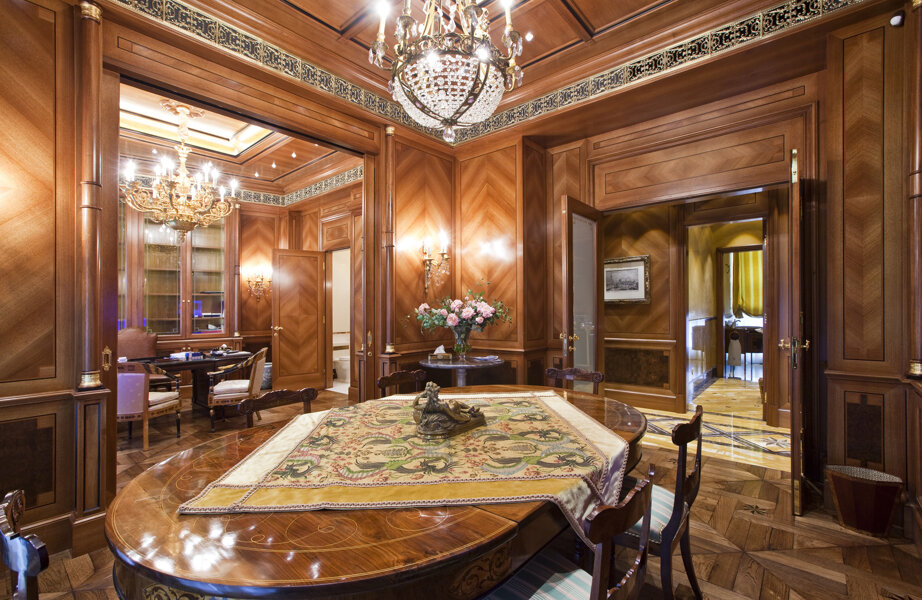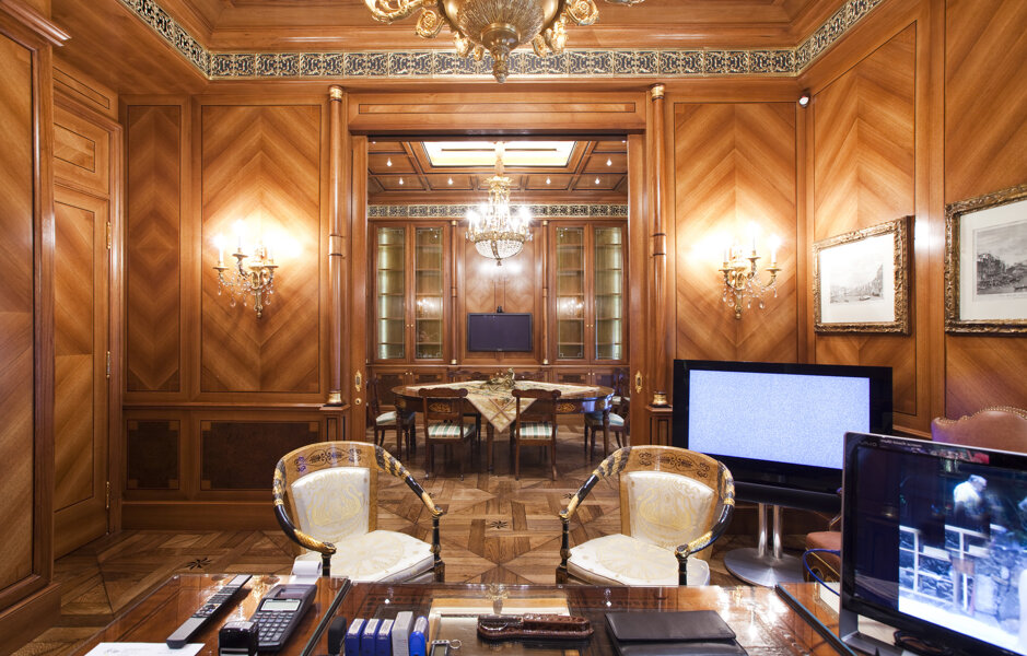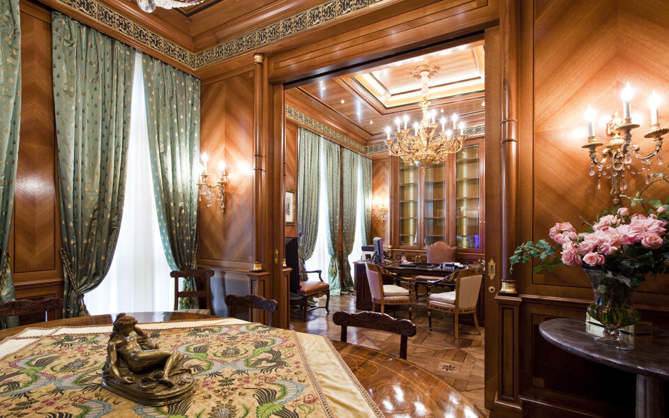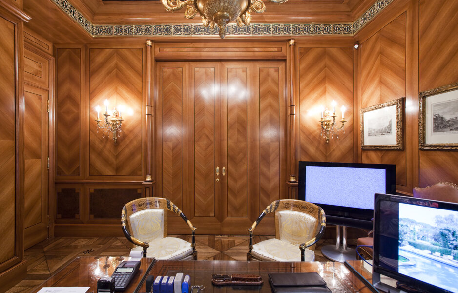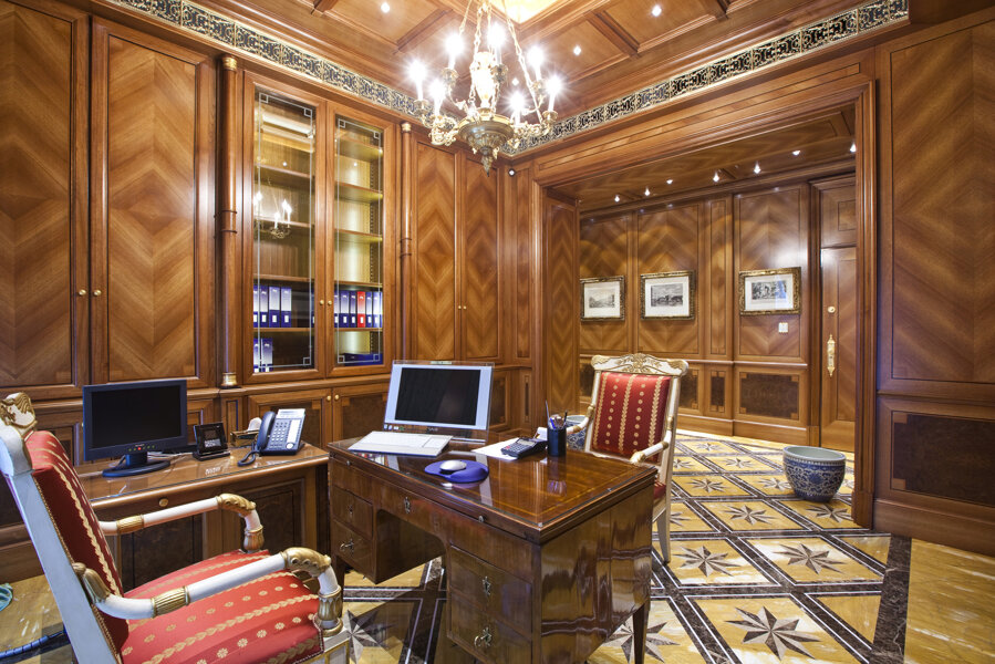 A private office in Milan's Brera district featuring cutting-edge classical furniture. The space boasts high-quality materials and finishes, including walnut veneer walls with geometric inlays, solid Amara ebony details, and brass accents. Notably, the gold details are not brass but precious 24-carat gold, adding a touch of opulence. The integrated boiserie doors and custom gold covered brass ceiling grills enhance the luxurious and cohesive aesthetic.
